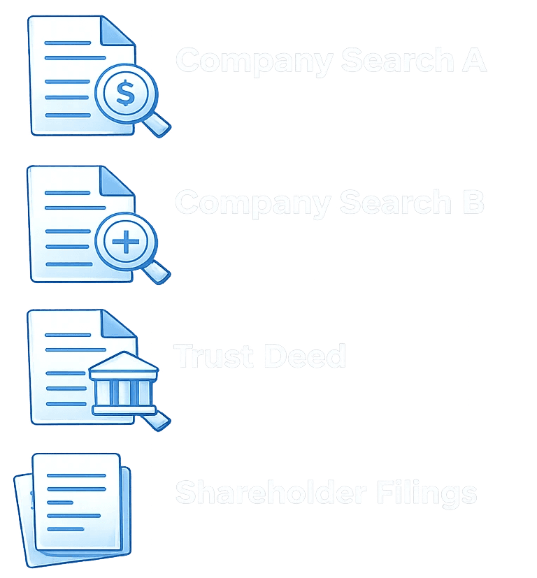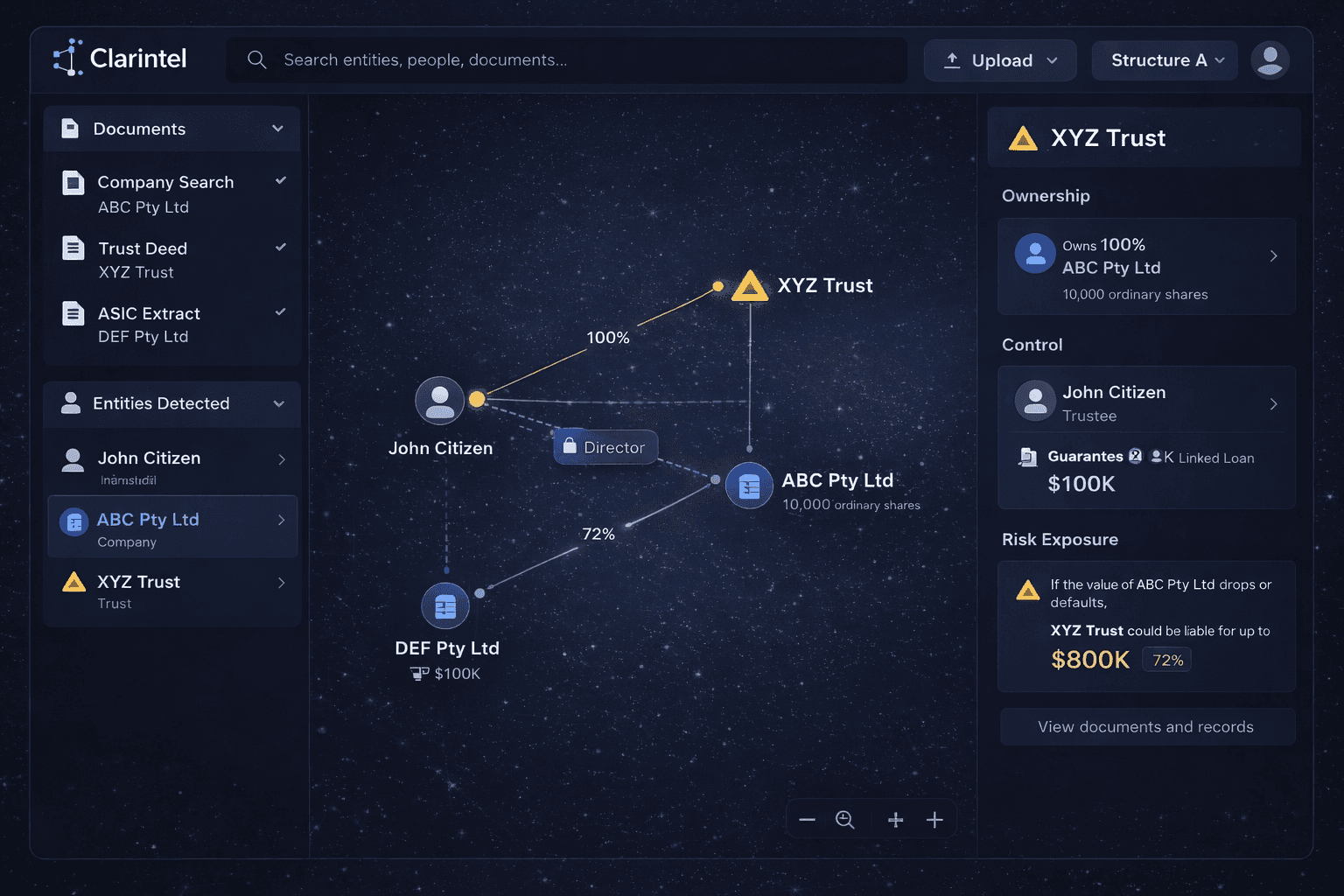 Upload company searches and related documents to generate a visual dashboard showing entity relationships, control pathways and potential exposure points.